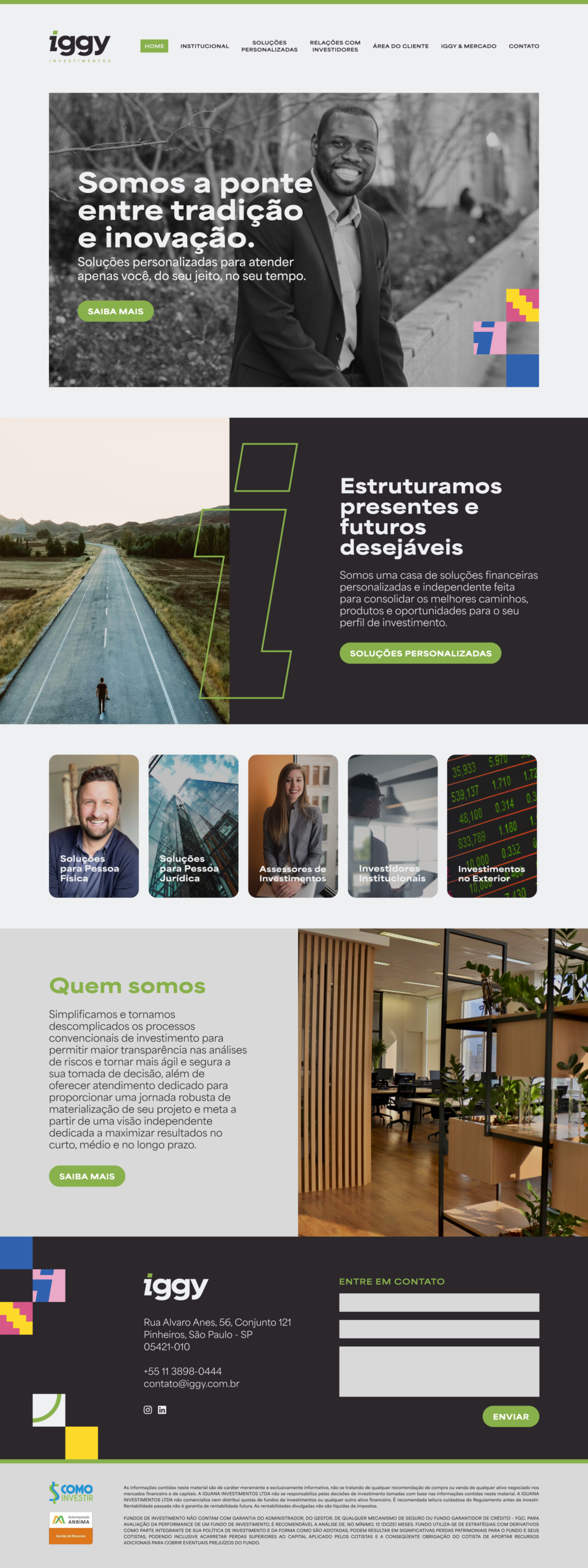 Em 2023, a Iguana Investimentos passou por um processo de rebranding completo que tornou a empresa mais moderna, sem perder seus fortes valores de confiança e segurança. Chamada agora de Iggy Investimentos, o processo de reestruturação de marca foi liderado pela Orolab, que me contratou para dar o pontapé em sua reestruturação visual.
